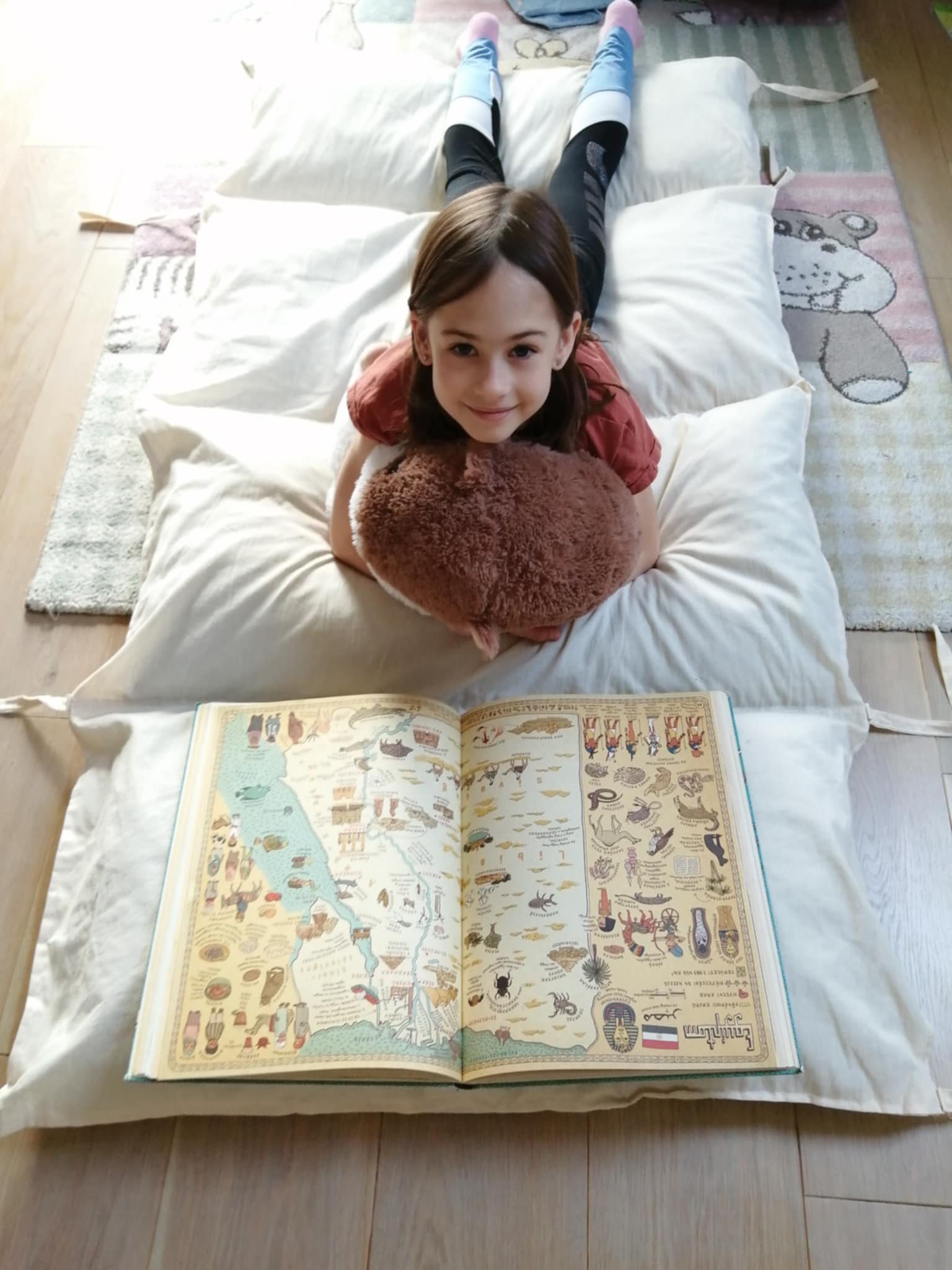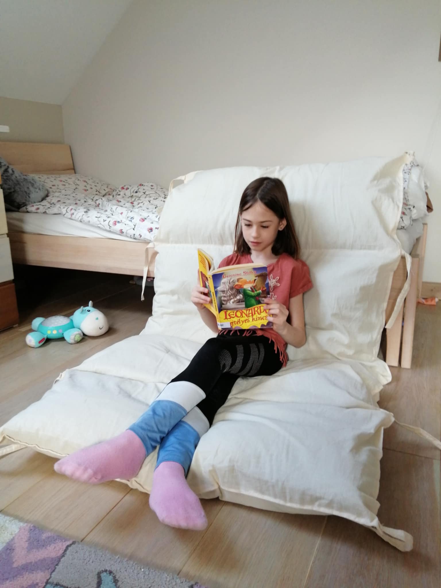 Gyerekszobák kedvence, tetszés szerint hajtogatható, padlón, bútornak, ágynak támasztva használható nappali heveredő olvasáshoz, játékhoz, beszélgetésekhez.